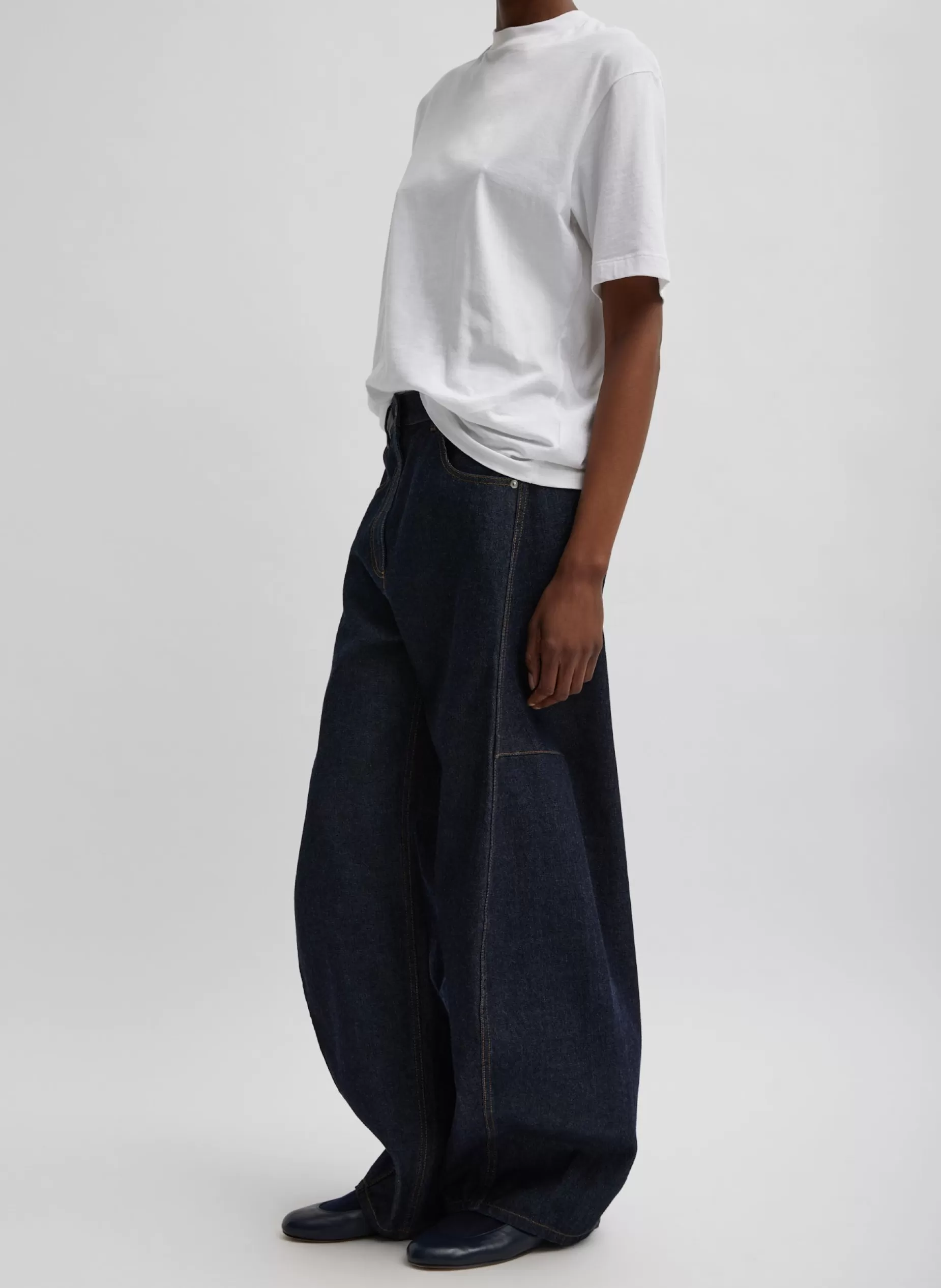 This assortment serves as your WOFs (Without Fails) and are designed to create space in your wardrobe for creativity and experimentation. No matter how extreme your closet may become, these pieces serve as the grounding element that ties everything together. Now offered in Indigo Denim, a cult favorite, the Sid Jean brings a unique aspect to your denim collection with its unique fit and design. This jean features both a wide leg silhouette that has a balloon-like shape as it gets tighter when it hits the floor. We have also heard your tailoring pleas, adding snaps at the hem for built in alterations. Pair this jean back to the basics such as the Ribbed T Tanks with a belt or dress them up with Feather Weight Leather Shirred Circular Top.